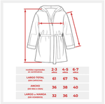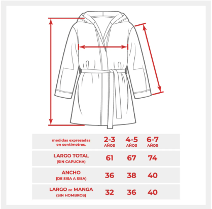 2-3 años: 61 cm largo total; 36 cm ancho; 32 cm largo de mangas