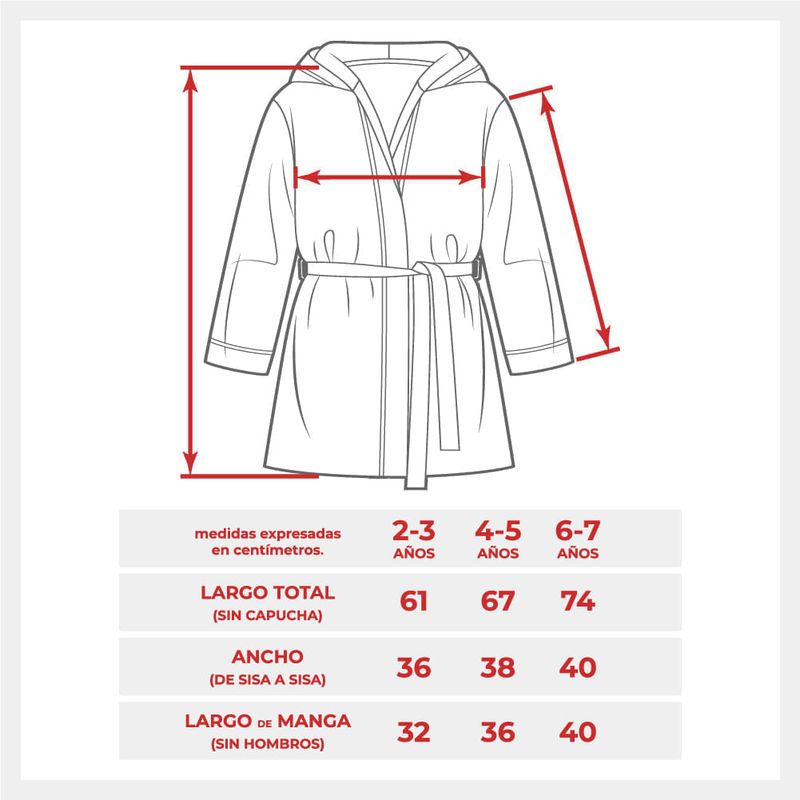 4-5 años: 67cm largo total; 38 cm ancho; 36 cm largo de mangas