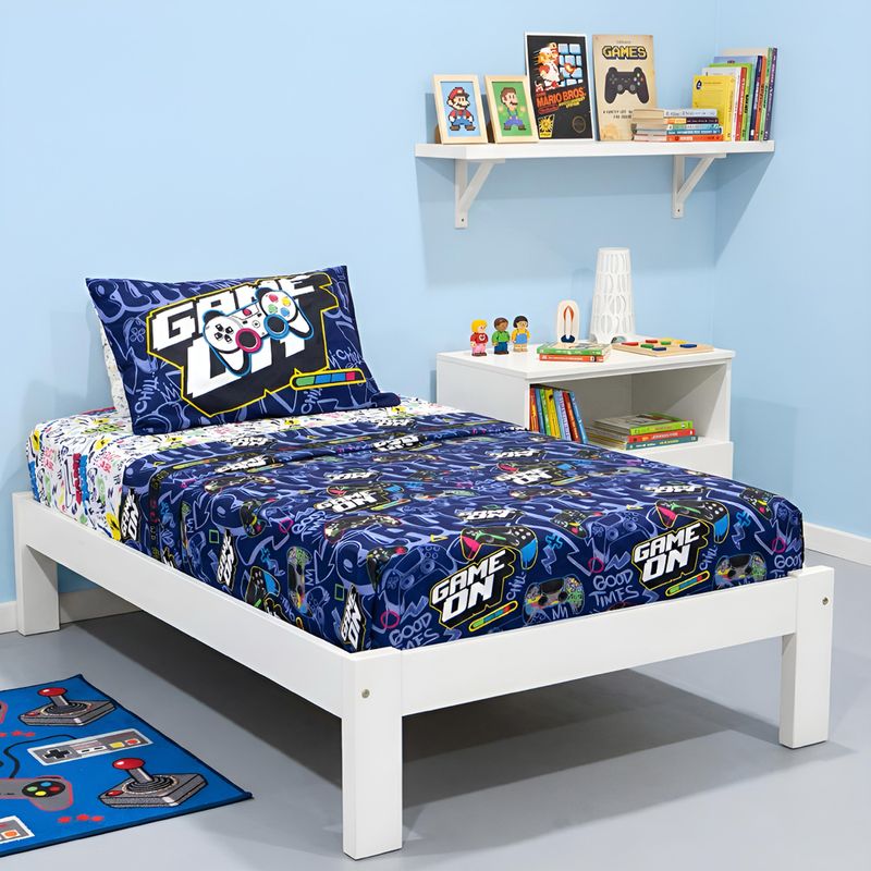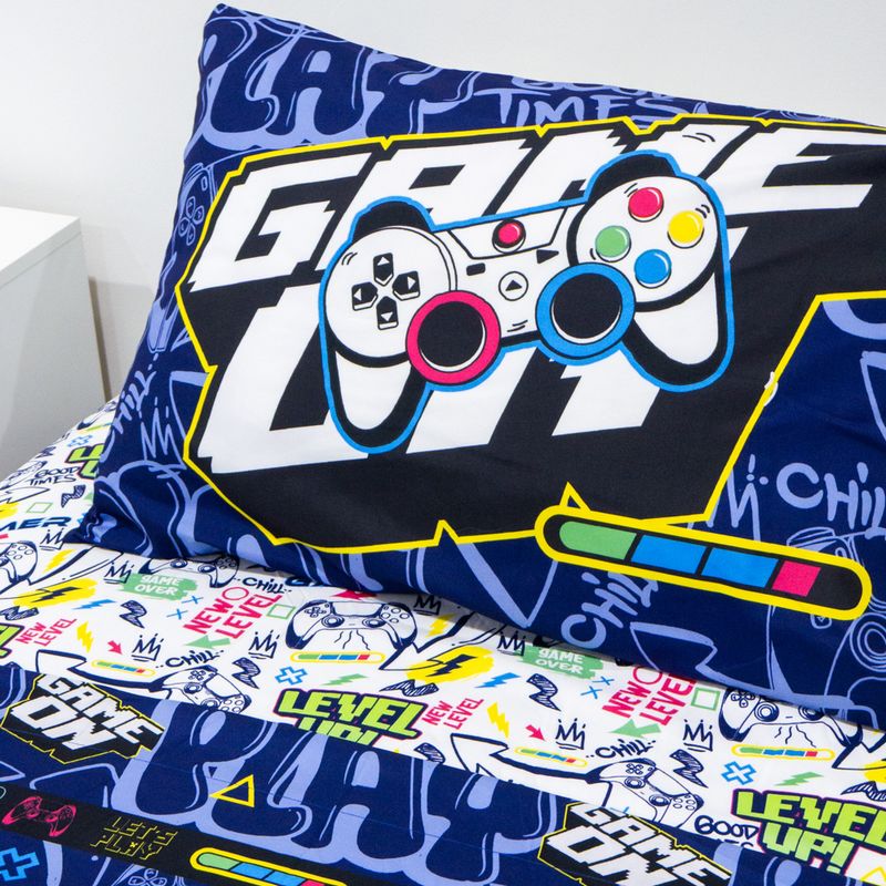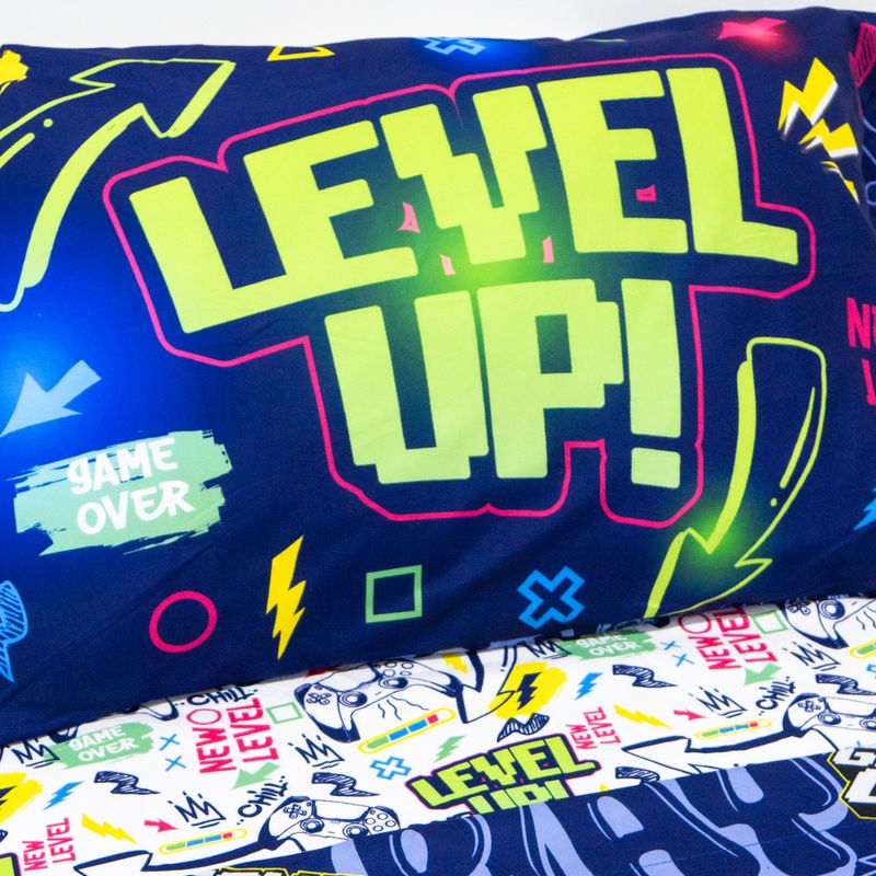 Transformá su dormitorio en la habitación gamer soñada con el Juego de Sábanas 1 ½ plaza GAMER – Level UP!, un diseño lleno de color, energía y elementos del mundo del gaming. Ideal para chicos y adolescentes apasionados por los videojuegos.