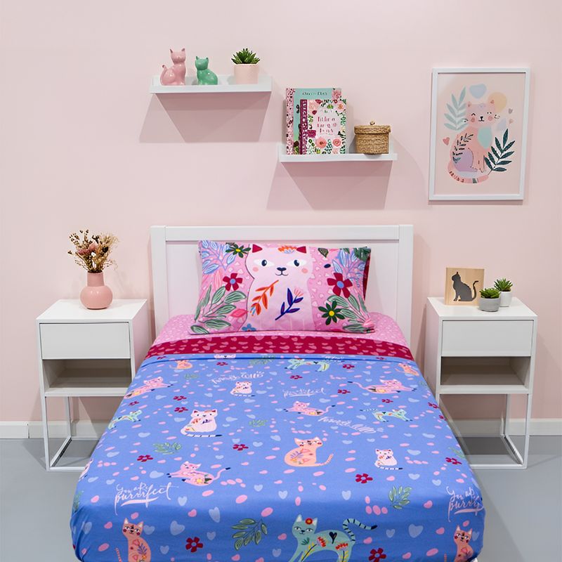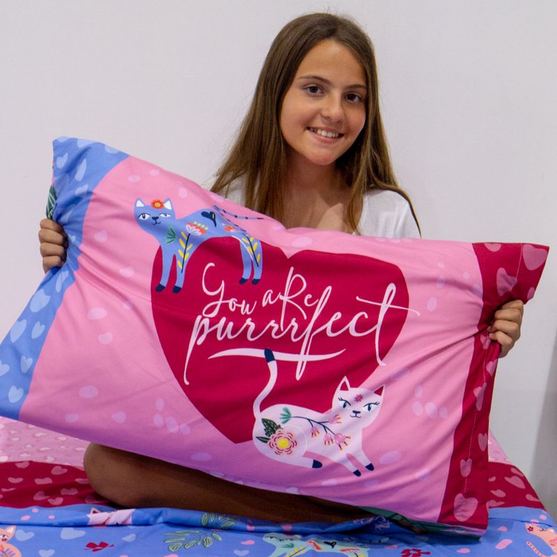 Llená su dormitorio de ternura, color y diversión con el Juego de Sábanas 1 ½ plaza WILD, un diseño encantador lleno de gatitos, corazones y detalles que inspiran dulzura. Ideal para niñas y preadolescentes que aman los colores vibrantes y los personajes tiernos.